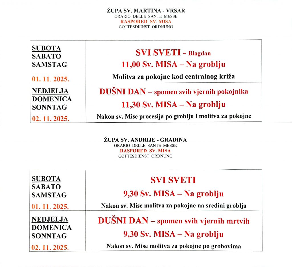 SVI SVETI i DUŠNI DAN u Vrsaru i Gradini 2025 Župnik 31. listopada 2025 Arhiva ← Proslava Sv. Mihovila u Kloštru Proslava Sv. Martina zaštitnika naše Župe →